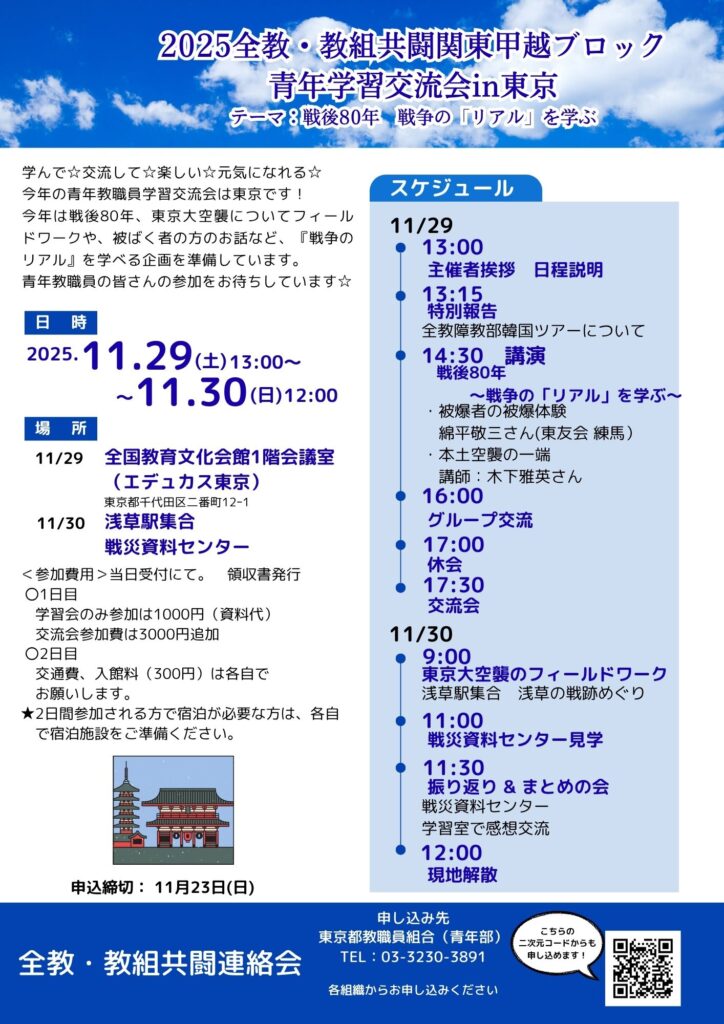 ○申込 組合員、未加入にかかわらず、参加していただけます。必ず申込をお願いします。チラシにある二次元コードから、または、教組共闘関東・甲越ブロック所属の各教職員組合・教職員連絡会に申し込んでください。締切は11月23日(日)です。