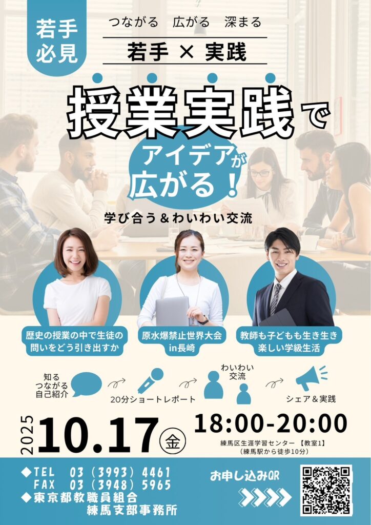 都教組練馬支部学習交流会(共済・ろうきんカフェ付)のお知らせ 投稿日 2025年10月8日 著者 tokyoso_master カテゴリー お知らせ カテゴリー 学習会 2025年10月17日(金)18時~20時 練馬区生涯学習センター教室1 つながる 広がる 深まる 授業実践でアイデアが広がる! 学び合う&わいわい交流 〇申込 下記チラシの二次元コードからお申込みください。無料です。練馬のみならず他地区の組合員、未加入にかかわらず、どなたでも参加できます。問い合わせ:都教組練馬支部 03-3993-4461(センターには問い合わせできません)