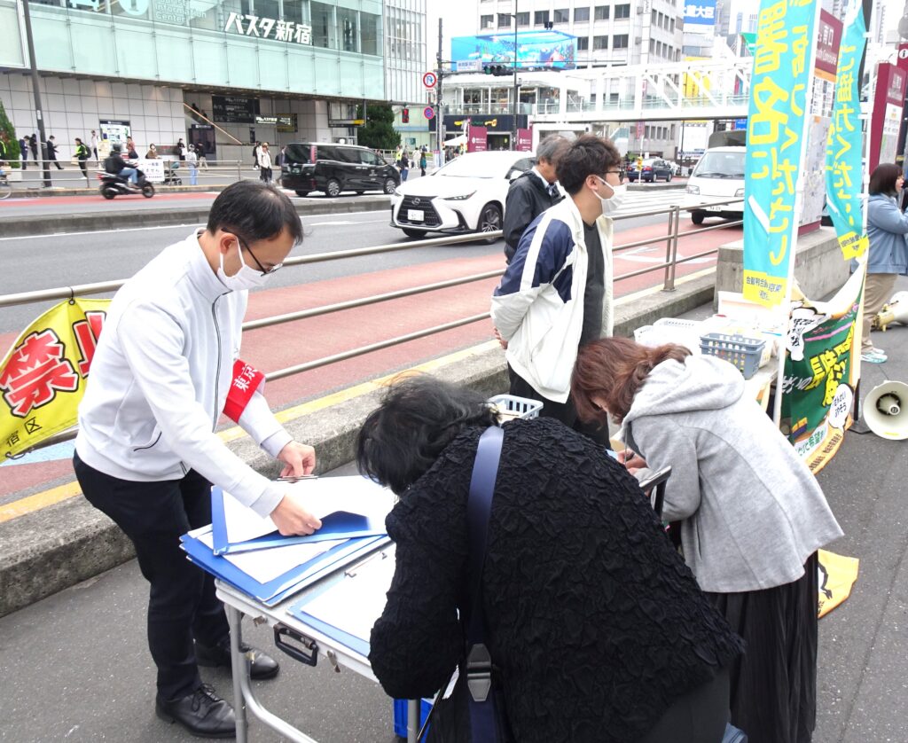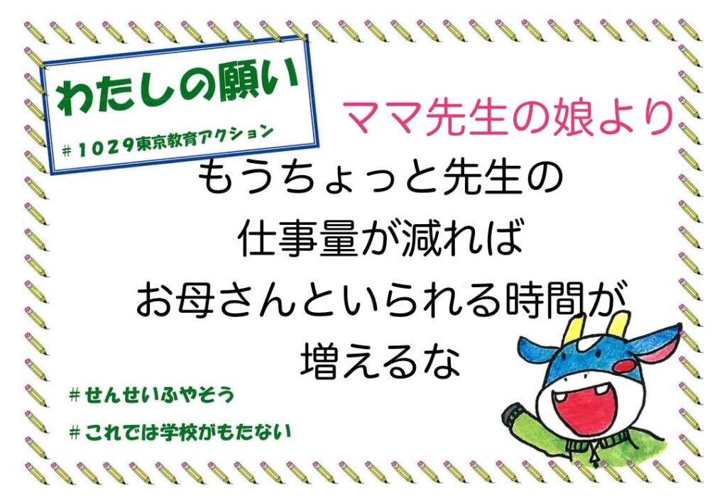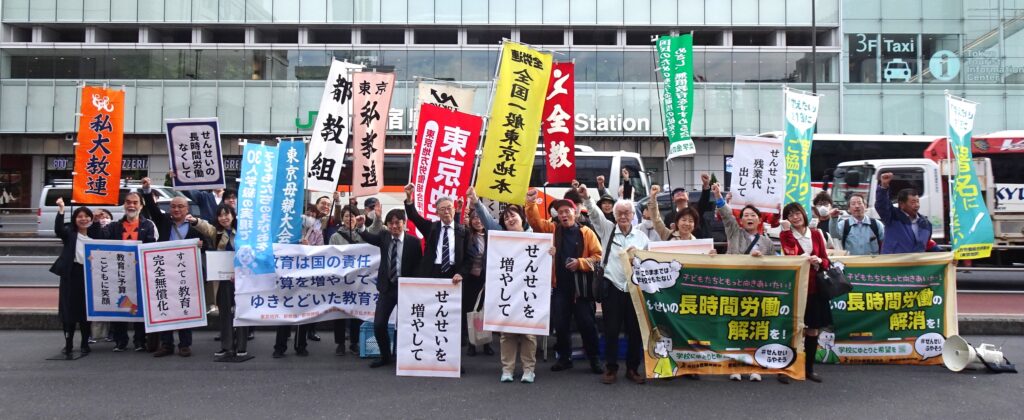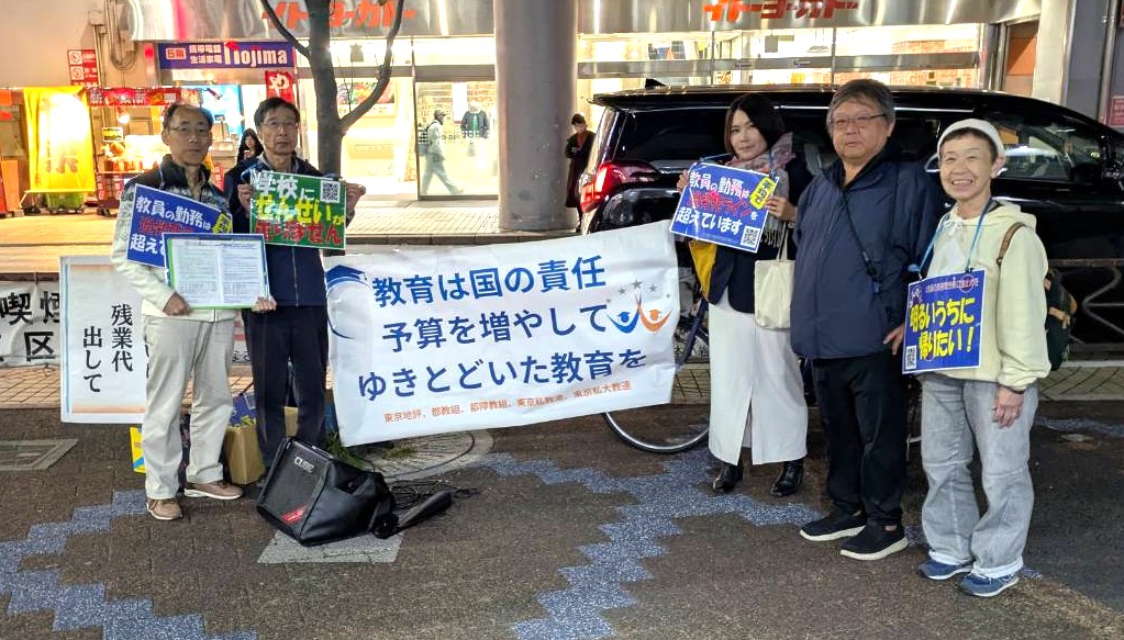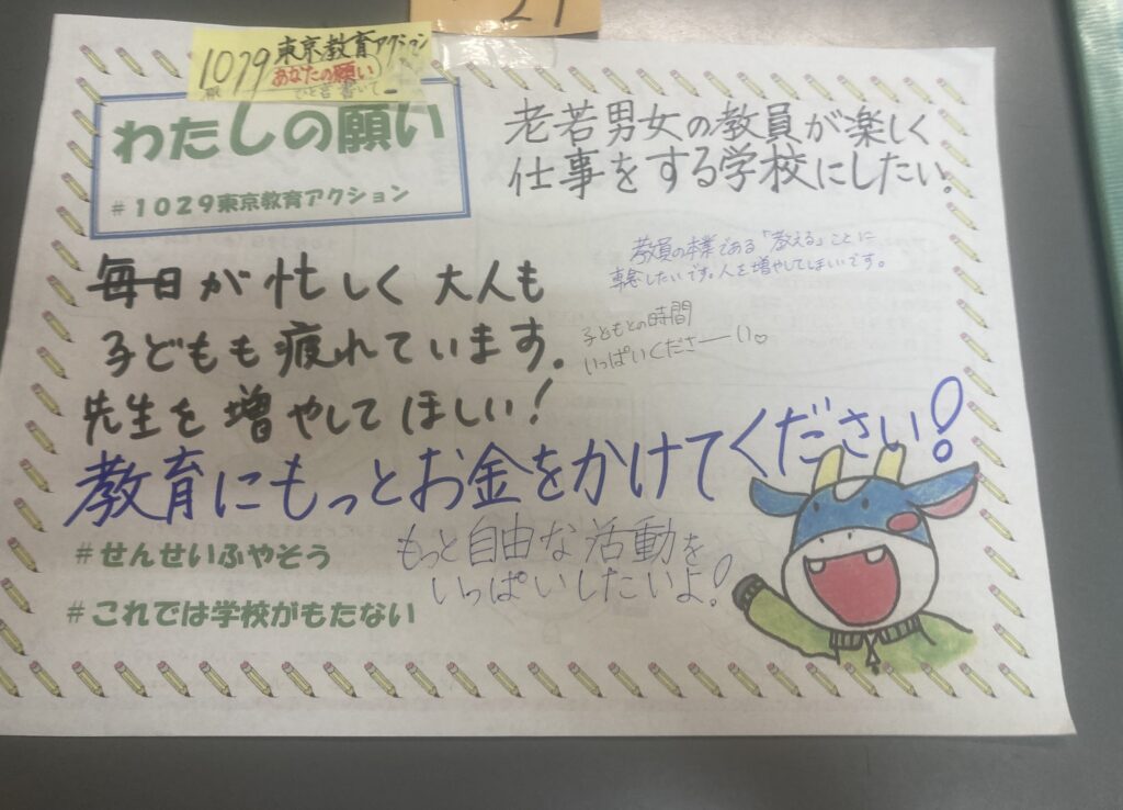 昨年度、教職員の長時間過密労働改善、教育予算増に向けた共同のとりくみとして、#1127、#0115全国・全都一斉定時アクションにとりくみ、世論をひろげ、通常国会で審議された給特法等改定審議に大きな影響をもたらし、中学校における35人学級に向けた動きにつながっています。しかし、教員への残業代支給は導入されず、教職調整額の引上げや、担任手当の支給、主務教諭の設置等が確認され、これでは長時間過密労働の解消どころか、一層加速させ、今以上に職場に差別と分断を持ち込みかねません。そこで、教育無償化の拡大の課題も含め、東京地評を中心に、都障教組、東京私教連、東京私大教連の共同で、10月27日から11月7日をゾーンとして、#1029東京教育アクションにとりくみました。昨年を上回る23の地域労組・単産の宣伝行動がとりくまれ、多くの都民がチラシを受け取り、署名に賛同しました。また、職場では定時退勤をしたり、集まって「わたしの願い」に寄書をしたり、都教組オンライン集会に参加したりして、職場世論をひろげました。