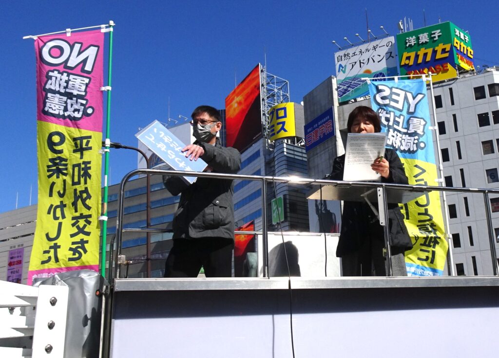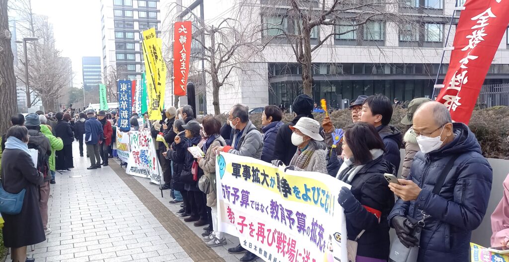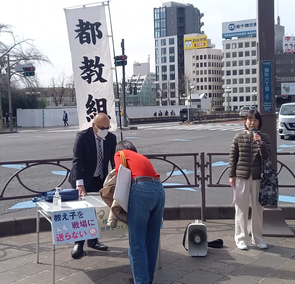 米国及びイスラエルによるイランへの軍事侵攻は、ロシアによるウクライナ侵攻と同様に、国連憲章・国際法違反にあたるのではないでしょうか。イラン国内の小学校が爆撃され、多くの子どもたちが犠牲になっています。都教組は、ただちに中止するよう、さまざまな機会に声をあげています。また、日本の来年度予算における防衛予算は9兆円を超えています。文教予算の約2倍にもなる規模です。防衛費のための増税も始まると聞いています。総がかり行動実行委員会等の呼びかけで全国でひろげてきた、防衛費を増やさないで、増税しないで、という請願署名宣伝を、今も、賛同団体・都民との共同で行っています。これからも声をあげていくことが必要です。