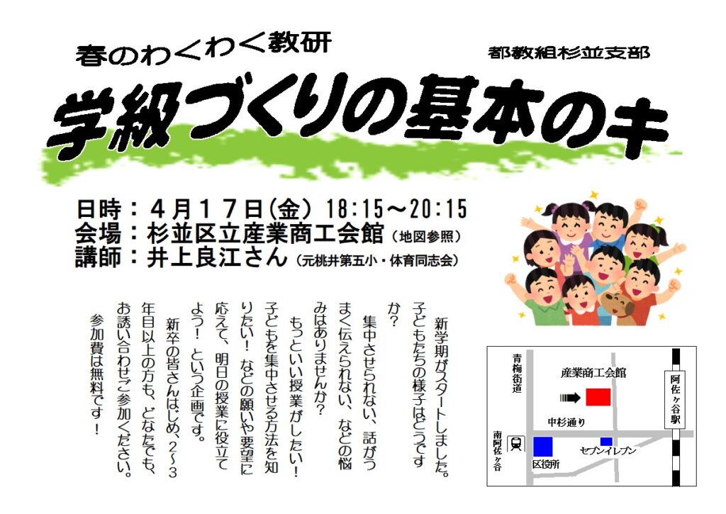 新採者歓迎! 都教組杉並支部「春のわくわく教研~学級づくりの基本のキ」のお知らせ(共済・ろうきんカフェ付[お菓子と飲み物あります]) 投稿日 2026年4月1日 著者 tokyoso_master カテゴリー お知らせ カテゴリー 学習会 4月17日(金)18時15分~20時15分 杉並区立産業商工会館 講師 井上 良江さん(元区内小学校教員、体育同志会所属) 〇申込は不要です。杉並区内の組合員、教職員はもとより、他地区の組合員、教職員も無料で参加できます。新採者の皆さん、青年教職員の皆さん、お気軽にご参加ください。ぜひ、職場や地域の皆さんでお誘いあわせの上、ご参加ください。都教組共済や中央ろうきんの話も聞けます。詳細は下記チラシをご覧ください。問い合わせ:杉並支部(03-3399-8719)