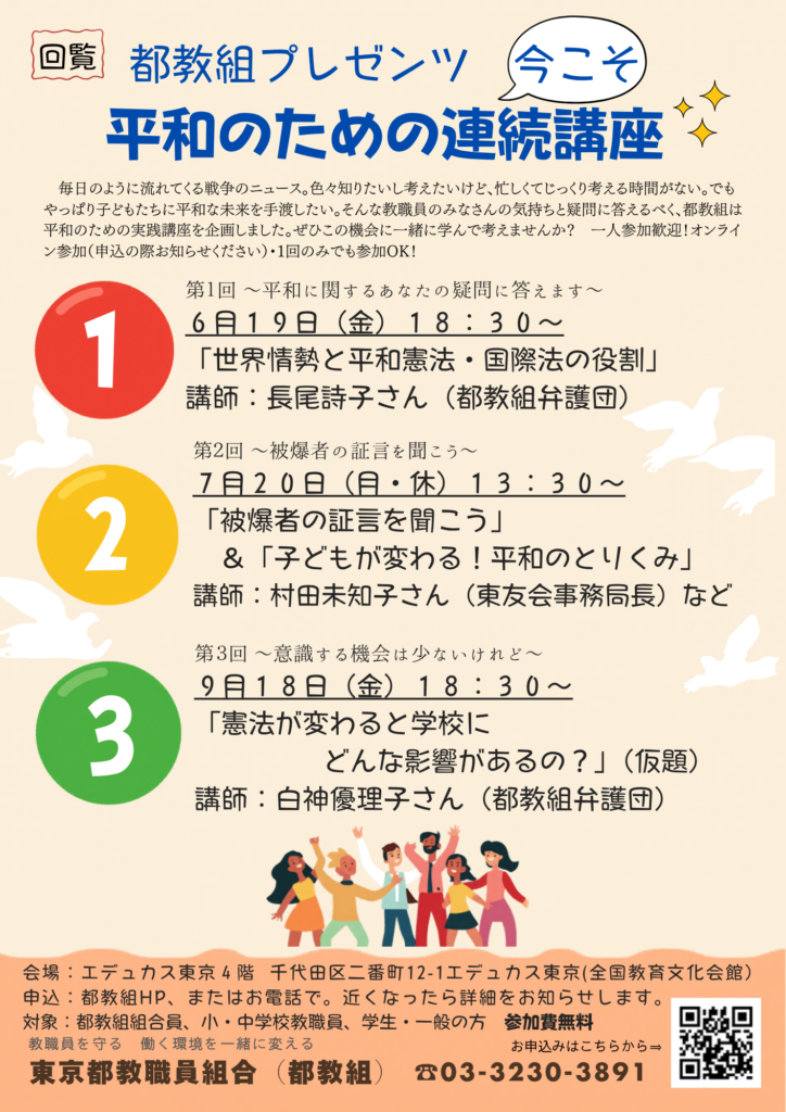 都教組では、東京大空襲・戦後81年、日本国憲法施行79年、また内外の情勢を受けて、改めて平和や憲法について考える連続講座を計画しました。組合員はもちろん、未加入者や労働組合、民主団体、都民の皆さんにも、無料で参加していただけます。ぜひご予定ください。それぞれに申込締切を設定しますが、今からでもお申込みいただけます。場所はいずれもエデュカス東京4階都教組会議室です。(できるだけ現地にお願いしたいのですが、オンラインでもご参加いただけます)